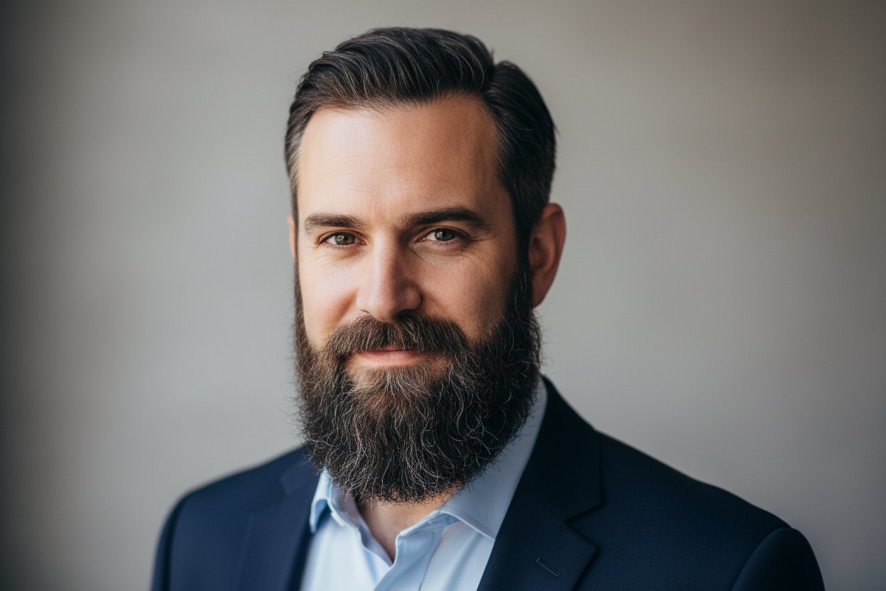 - Kurzer Goatee mit klarer Kieferlinie: ähnlicher Fokus, aber weniger „Rahmen“